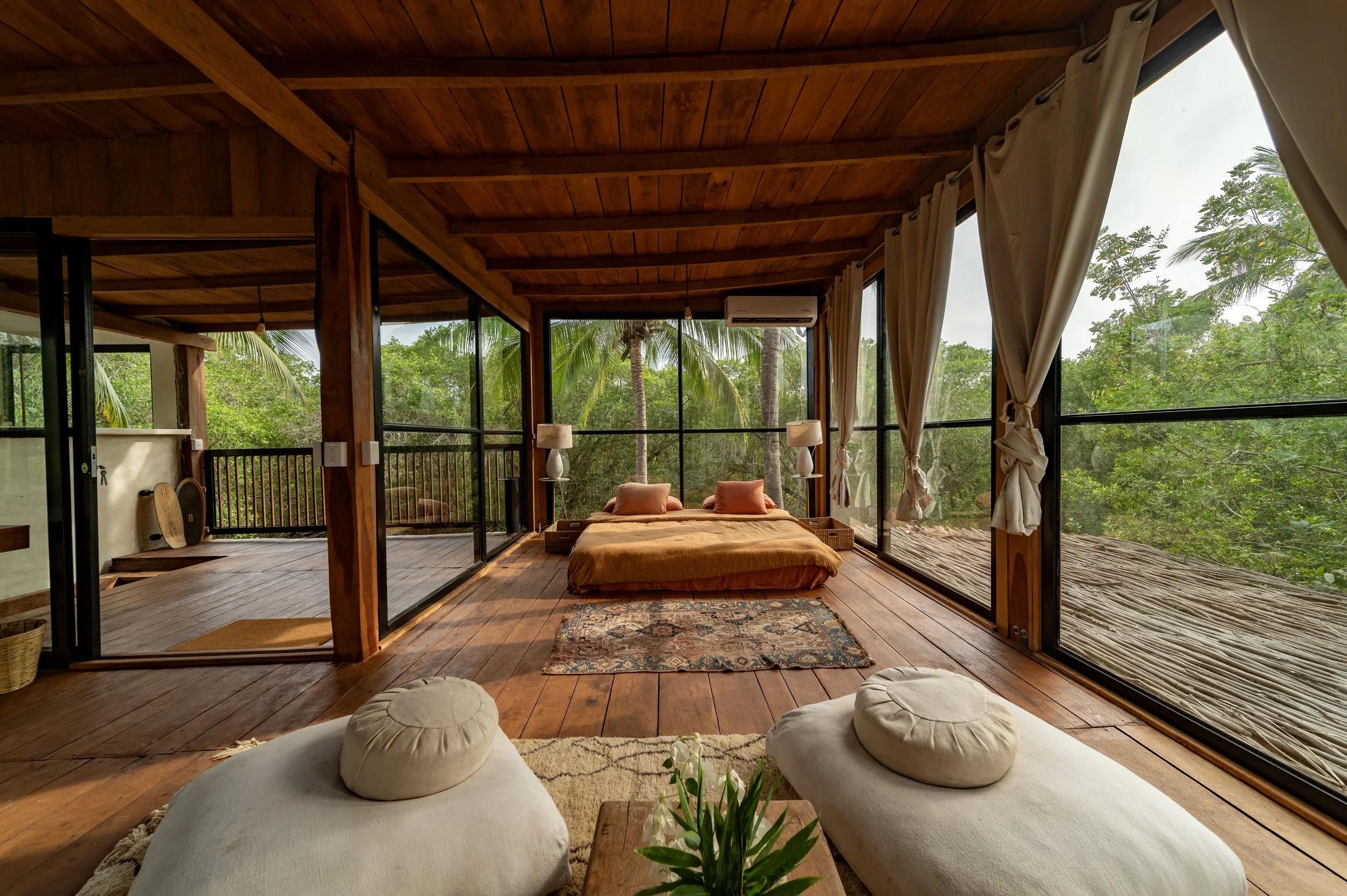 Templo started as a nonprofit yoga project for the Saladita community, and that backbone is still here. Classes are held in a screened, hexagon yoga platform tucked into the trees—a quiet, breezy space that fits around 16 people comfortably.